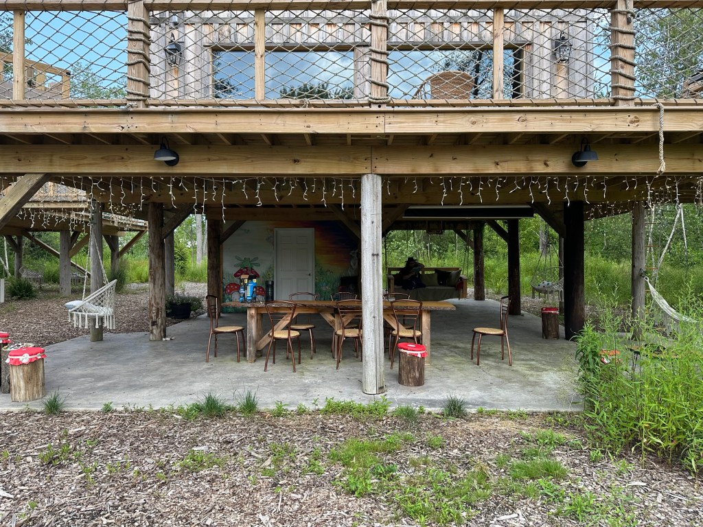 When you arrive at Piper Hollow, the first thing you notice is the hanging seats underneath. They even have a projector and screen for watching outdoor movies.