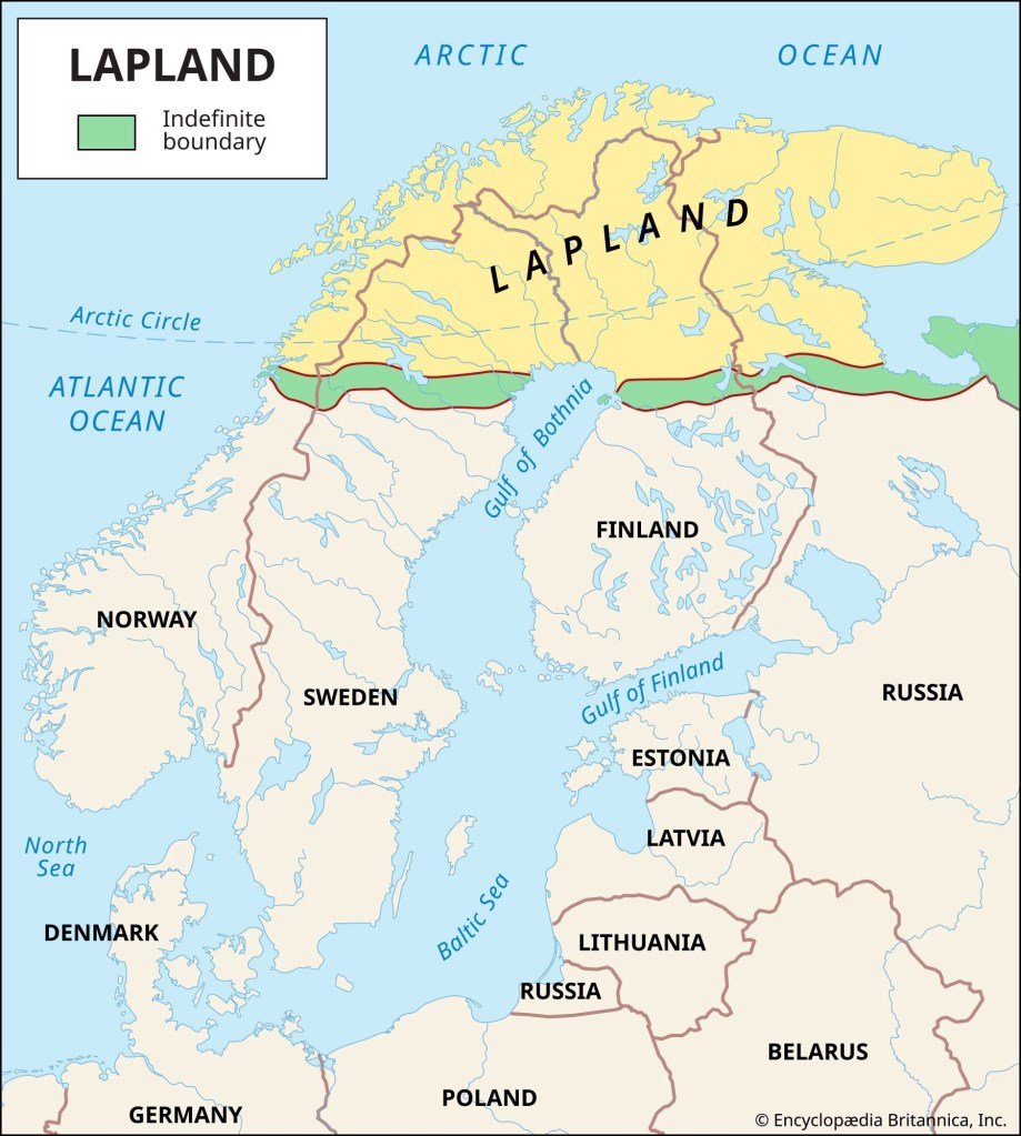 Lapland is a region, primarily within the Arctic Circle, that stretches across the northern parts of Norway, Sweden, Finland, and Russia.